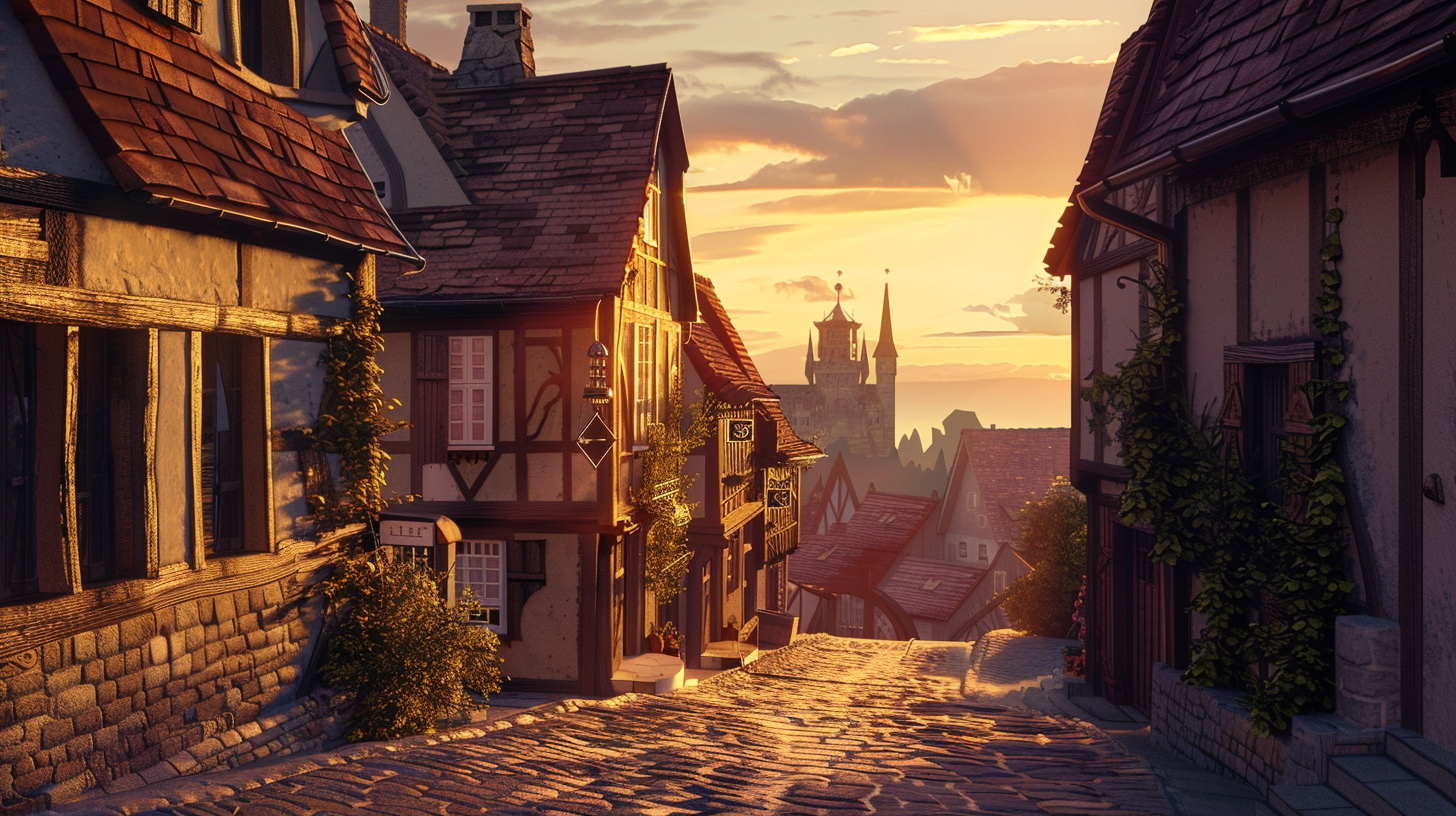 Step into a tranquil European village bathed in the warm golden glow of sunset. This hand-painted anime-inspired wallpaper captures the nostalgic charm of medieval architecture, cobblestone streets, and rustic timber houses covered in ivy. The soft light and long shadows create a peaceful, storybook atmosphere that feels both timeless and comforting.