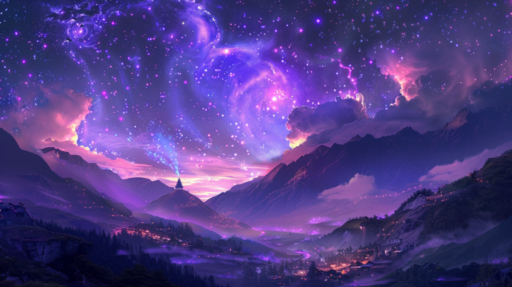 Surreal Galaxy Sky Over a Quiet Mountain Village – Purple Dream Night Wallpaper