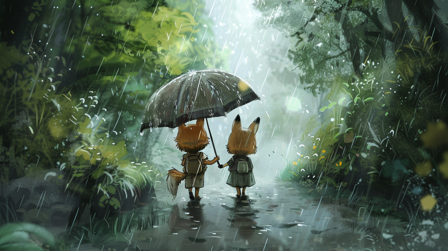 A heartwarming scene of two small forest friends walking hand in hand under a single umbrella in the gentle rain. This adorable anime-style illustration captures the essence of quiet companionship and the beauty of a rainy day in nature.